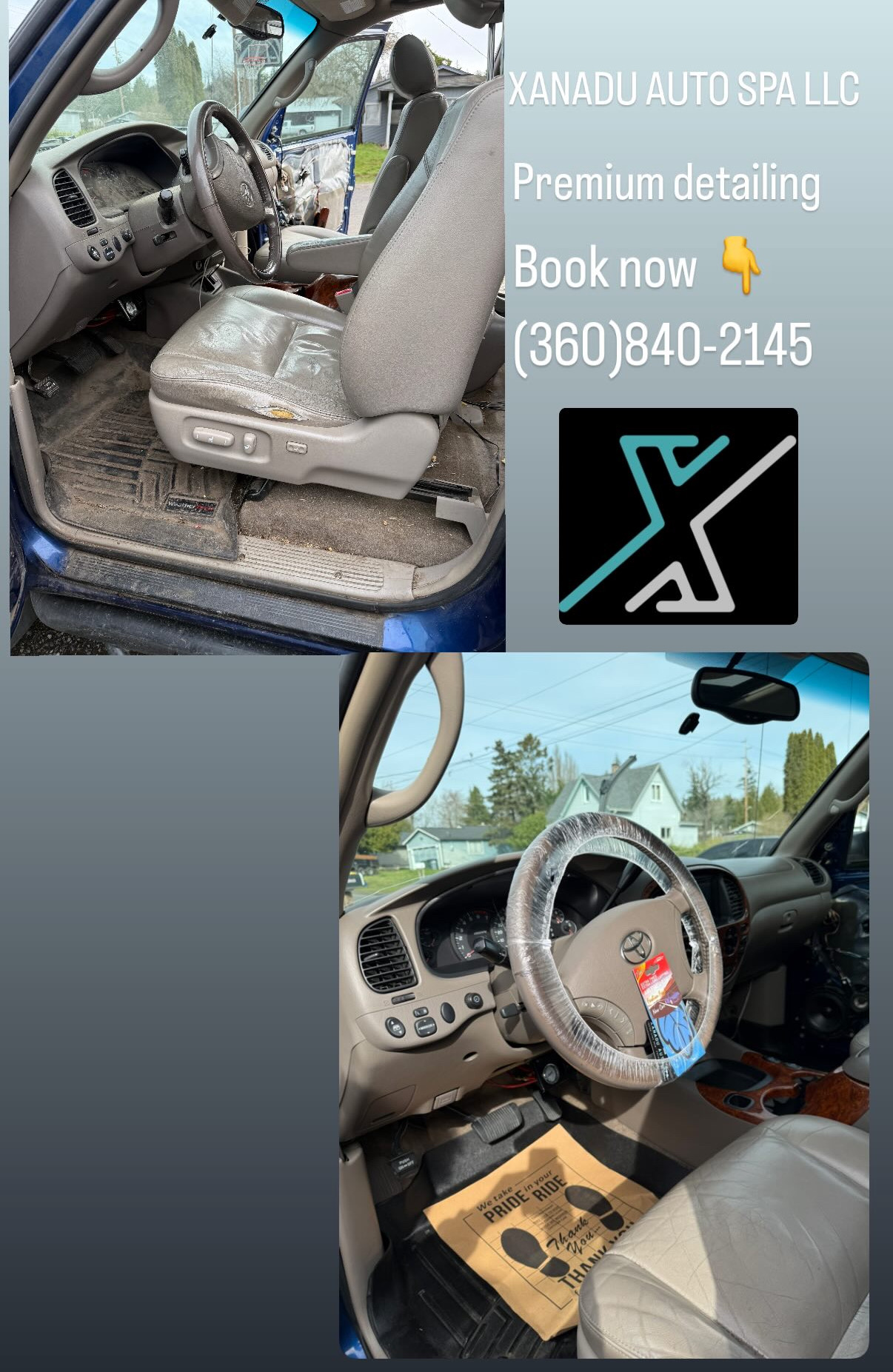 This package includes - Full vehicle vacuuming and disinfection - Full vehicle air blowout - Carpet and upholstery shampooing - UV protective and dust repellent dressing - Window cleaning with 3-week rain repellent coating - Final touch package included: - Steering wheel cover - Floor mats - 7-day air freshener!